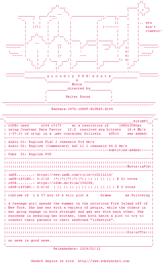 Voir le nfo de la release Barbara.1970.1080P.BLURAY.x264-WATCHABLE