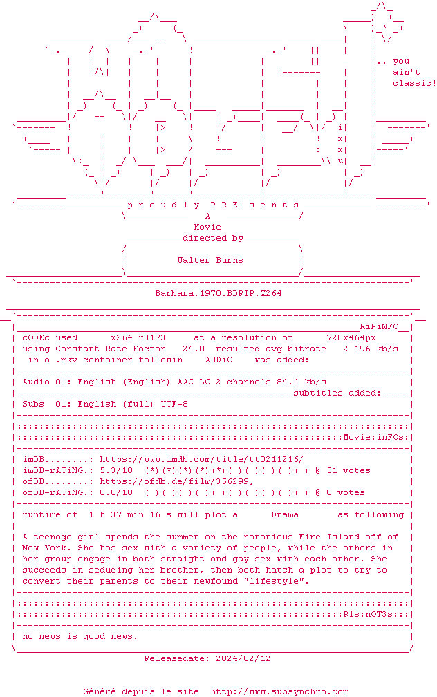 Voir le nfo de la release Barbara.1970.BDRIP.x264-WATCHABLE