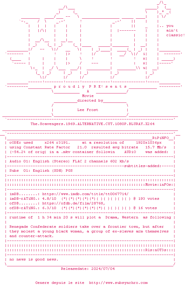 Voir le nfo de la release The.Scavengers.1969.ALTERNATIVE.CUT.1080P.BLURAY.x264-WATCHABLE
