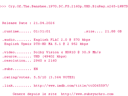 La release Cry.Of.The.Banshee.1970.DC.FS.2160p.UHD.BluRay.x265-LWRTD est en 4K