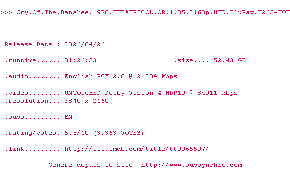 Y avez-vous pense ? Nous proposons déjà 2108 sous-titres pour le film Les Crocs de Satan. Avez-vous essaye de voir si ces sous-titres etaient compatibles avec cette release ? On vous laisse le soin de tester cela pour nous et de contribuer au site en postant le sous-titre en cas de compatiblite constatee !