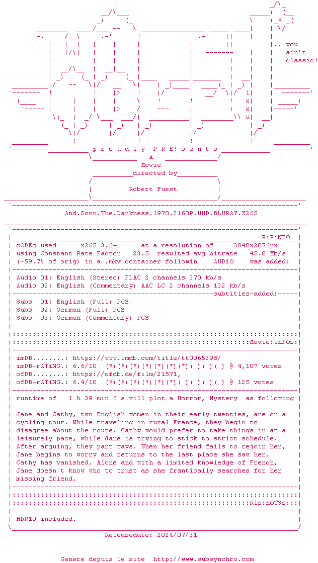 Voir le nfo de la release And.Soon.The.Darkness.1970.2160P.UHD.BLURAY.x265-WATCHABLE