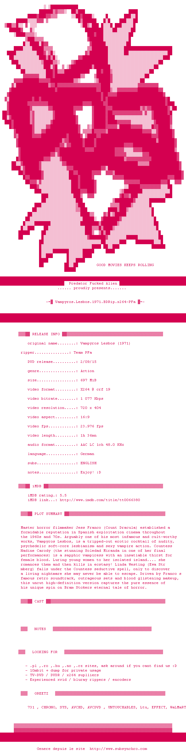 Y avez-vous pense ? Nous proposons déjà 2124 sous-titres pour le film L'Héritière de Dracula. Avez-vous essaye de voir si ces sous-titres etaient compatibles avec cette release ? On vous laisse le soin de tester cela pour nous et de contribuer au site en postant le sous-titre en cas de compatiblite constatee !