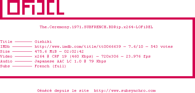 | Voir le nfo de la release The.Ceremony.1971.SUBFRENCH.BDRip.x264-FiDELO | FiDELO | The.Ceremony.1971.SUBFRENCH.BDRip.x264-FiDELO OpenSubtitles | 0 fichier |