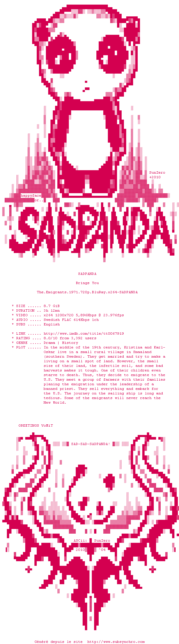 Voir le nfo de la release The.Emigrants.1971.720p.BluRay.x264-SADPANDA