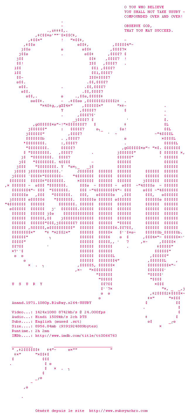 | Voir le nfo de la release Anand.1971.1080p.BluRay.x264-USURY | USURY | Anand.1971.1080p.BluRay.x264-USURY OpenSubtitles | 0 fichier |