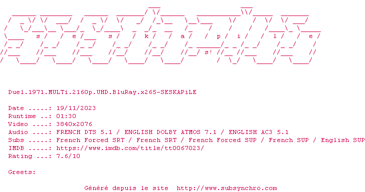 Voir le nfo de la release Duel.1971.MULTi.2160p.UHD.BluRay.x265-SESKAPiLE