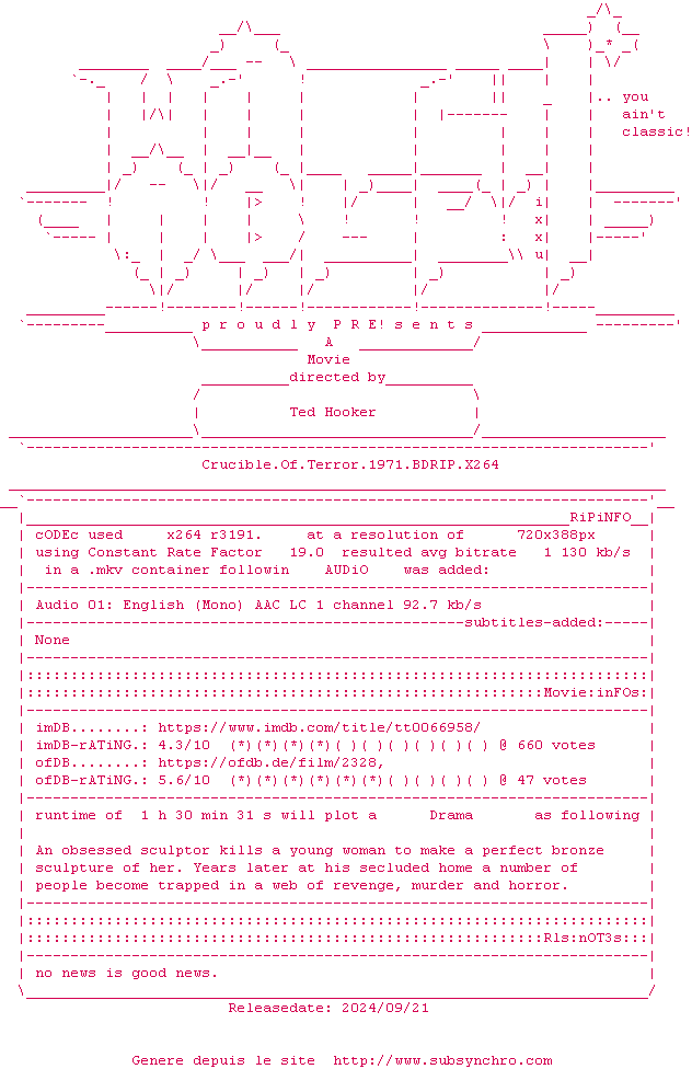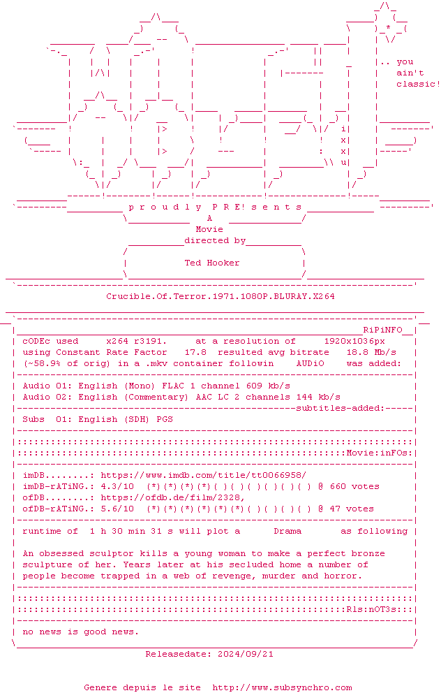 Voir le nfo de la release Crucible.Of.Terror.1971.1080P.BLURAY.x264-WATCHABLE