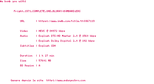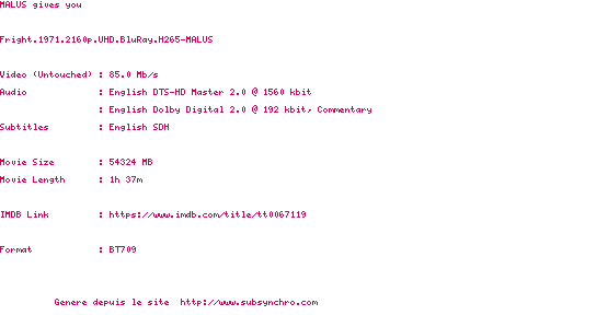 Voir le nfo de la release Fright.1971.2160p.UHD.BluRay.H265-MALUS