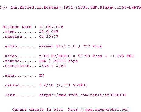Y avez-vous pense ? Nous proposons déjà 1630 sous-titres pour le film Crimes dans l'extase / She.Killed in Ecstasy. Avez-vous essaye de voir si ces sous-titres etaient compatibles avec cette release ? On vous laisse le soin de tester cela pour nous et de contribuer au site en postant le sous-titre en cas de compatiblite constatee !