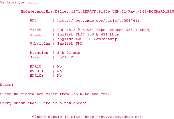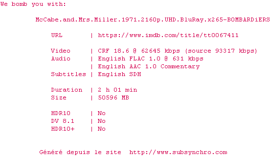 Voir le nfo de la release McCabe.And.Mrs.Miller.1971.2160p.UHD.BluRay.x265-B0MBARDiERS