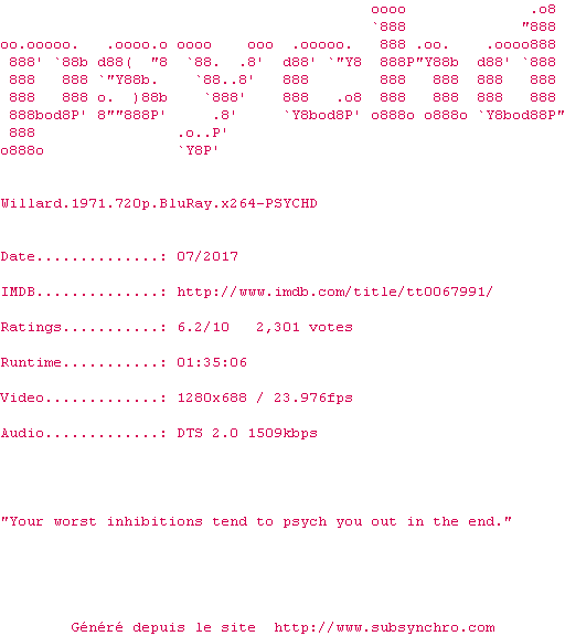 | Voir le nfo de la release Willard.1971.1080p.BluRay.x264-PSYCHD | PSYCHD | Willard.1971.1080p.BluRay.x264-PSYCHD OpenSubtitles | 0 fichier | ||