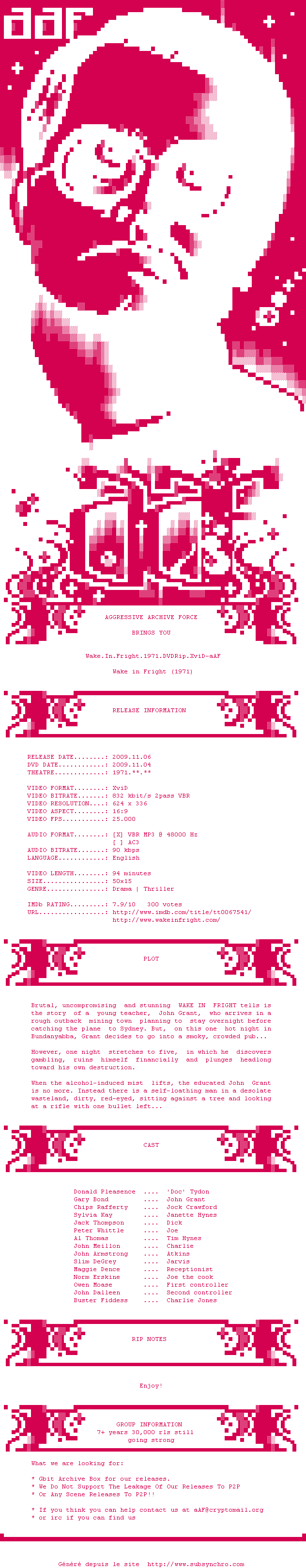 Voir le nfo de la release Wake.In.Fright.1971.DVDRip.XviD-aAF