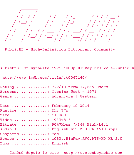 Telechargez le RSS « Fichier de la release A.Fistful.Of.Dynamite.1971.1080p.BluRay.DTS.x264-PublicHD »