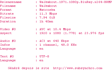 Walkabout.1971.1080p.BluRay.x264-BRMP.srt Ajouté par Ultimhate Ajoute le 18-04-2012 14:26:17 Format : SRT Italique : Oui Taille : 0.00Ko Telechargement : 92 Sous-titre Extrait d'un DVD Z2 Ajouter cette release à ma collection en cas de telechargement des sous-titres 0 0 0 Telecharger le ZiP contenant NFO, Affiche, Sous-titre (*.srt) Commentez le fichier Walkabout.1971.1080p.BluRay.x264-BRMP.srt Commentez le fichier Walkabout.1971.1080p.BluRay.x264-BRMP.srt Commentez ce fichier Le fichier 138-1334751977.srt n'existe pas ! Telechargez le RSS « Fichier de la release Walkabout.1971.1080p.BluRay.x264-BRMP » Retour au film « La Randonnée »