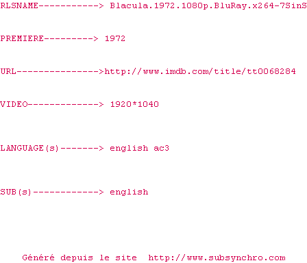 | Voir le nfo de la release Blacula.1972.1080p.BluRay.x264-7SinS | 7SinS | Blacula.1972.1080p.BluRay.x264-7SinS OpenSubtitles | 0 fichier | ||