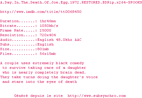 | Voir le nfo de la release A.Day.In.The.Death.Of.Joe.Egg.1972.RESTORED.BDRip.x264-SPOOKS | SPOOKS | A.Day.In.The.Death.Of.Joe.Egg.1972.RESTORED.BDRip.x264-SPOOKS OpenSubtitles | 0 fichier |