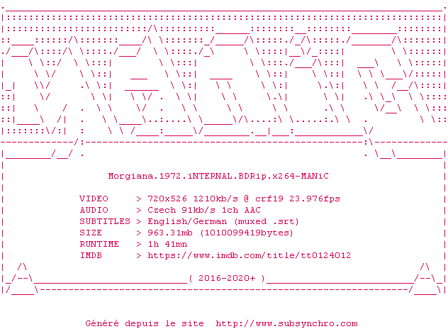 Voir le nfo de la release Morgiana.1972.iNTERNAL.BDRip.x264-MANiC