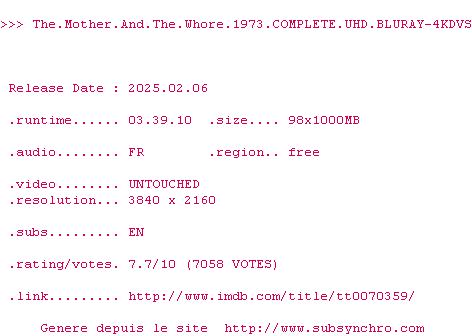 Voir le nfo de la release The.Mother.And.The.Whore.1973.COMPLETE.UHD.BLURAY-4KDVS