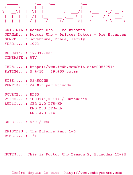| Voir le nfo de la release Doctor.Who.-.The.Mutants.1972.DUAL.COMPLETE.BLURAY-FULLSiZE | FULLSiZE | Doctor.Who.-.The.Mutants.1972.DUAL.COMPLETE.BLURAY-FULLSiZE OpenSubtitles | 0 fichier |