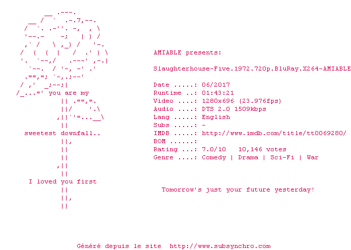 Voir le nfo de la release Slaughterhouse-Five.1972.REMASTERED.720p.BluRay.x264-AMIABLE