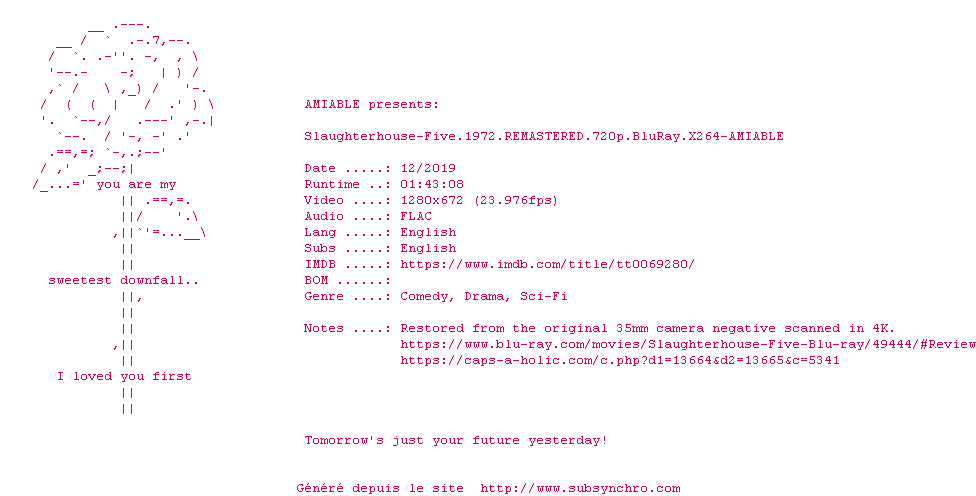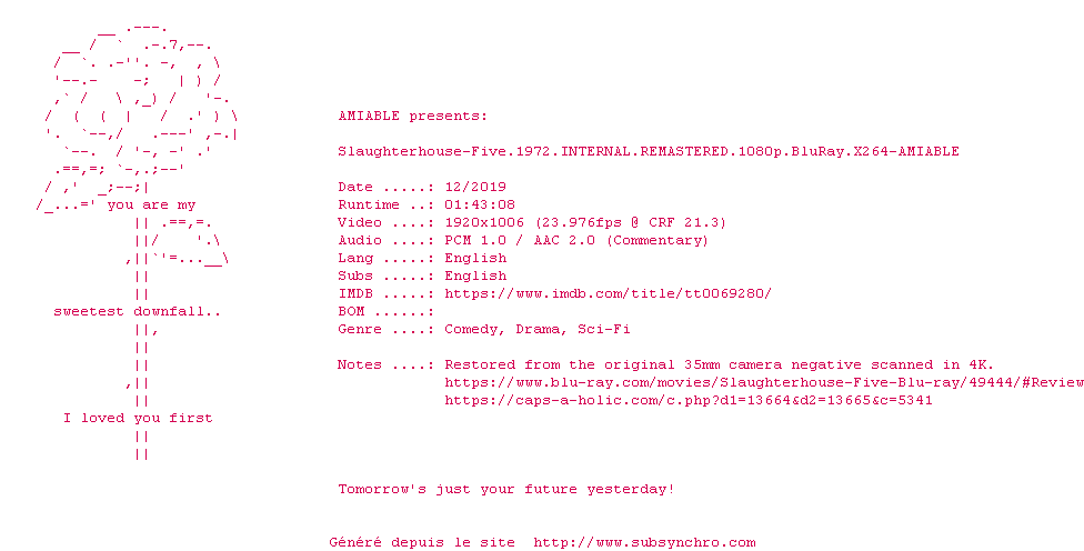 Voir le nfo de la release Slaughterhouse-Five.1972.iNTERNAL.REMASTERED.1080p.BluRay.x264-AMIABLE