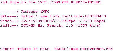 | Voir le nfo de la release And.Hope.To.Die.1972.COMPLETE.BLURAY-INCUBO | INCUBO | And.Hope.To.Die.1972.COMPLETE.BLURAY-INCUBO OpenSubtitles | 0 fichier | ||