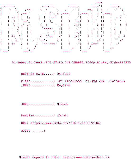Y avez-vous pense ? Nous proposons déjà 2144 sous-titres pour le film La peur au ventre / So Sweet, So Dead. Avez-vous essaye de voir si ces sous-titres etaient compatibles avec cette release ? On vous laisse le soin de tester cela pour nous et de contribuer au site en postant le sous-titre en cas de compatiblite constatee !