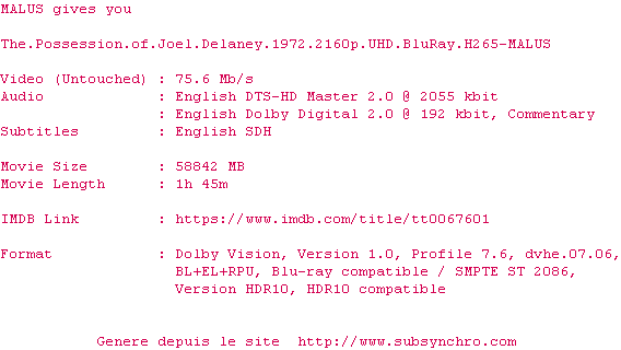 Voir le nfo de la release The.Possession.Of.Joel.Delaney.1972.2160p.UHD.BluRay.H265-MALUS