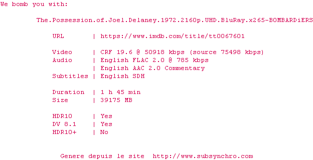 Voir le nfo de la release The.Possession.Of.Joel.Delaney.1972.2160p.UHD.BluRay.x265-B0MBARDiERS
