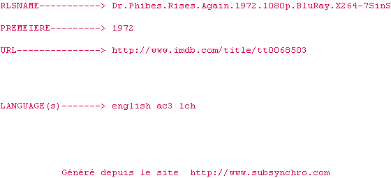 Voir le nfo de la release Dr.Phibes.Rises.Again.1972.1080p.BluRay.X264-7SinS