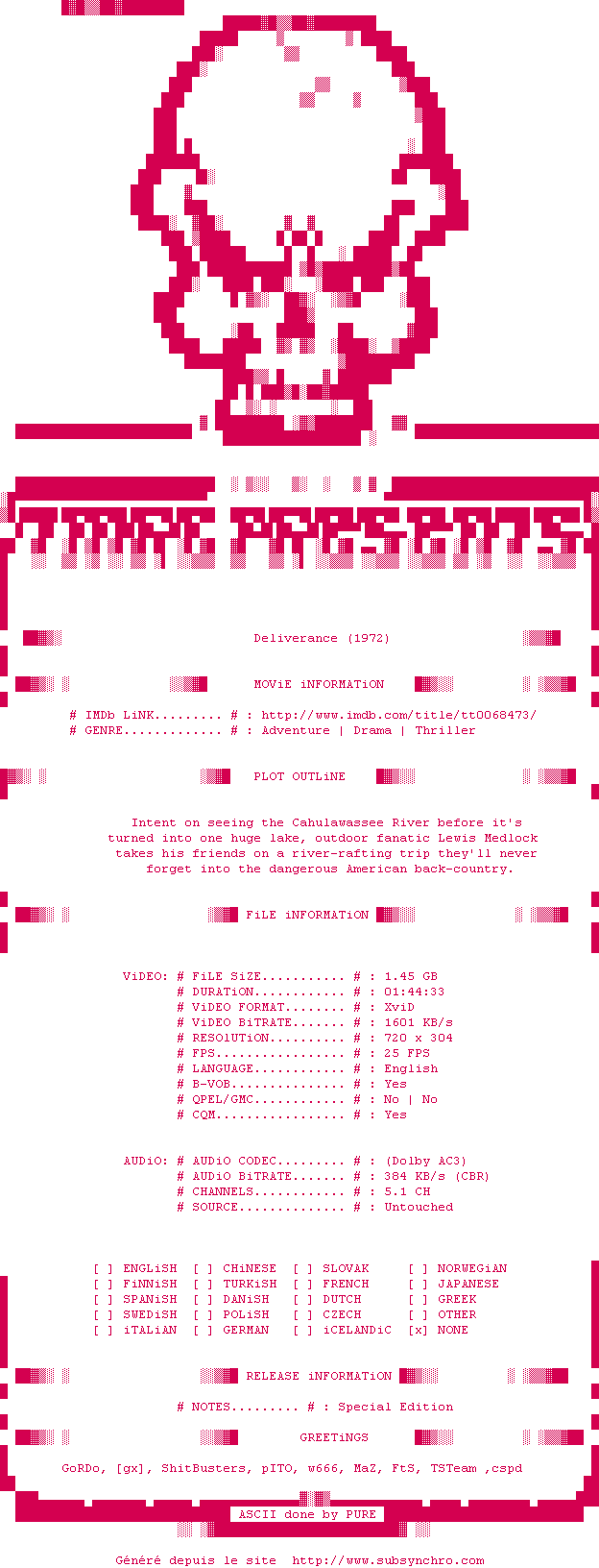 Deliverance.1972.SE.DVDRip.AC3.XviD-TMRC.srt Ajouté par Ultimhate Ajoute le 11-08-2011 02:48:38 Format : SRT Italique : Non Taille : 0.00Ko Telechargement : 279 Sous-titre Extrait d'un DVD Z2 Ajouter cette release à ma collection en cas de telechargement des sous-titres 0 0 0 Telecharger le ZiP contenant NFO, Affiche, Sous-titre (*.srt) Commentez le fichier Deliverance.1972.SE.DVDRip.AC3.XviD-TMRC.srt Commentez le fichier Deliverance.1972.SE.DVDRip.AC3.XviD-TMRC.srt Commentez ce fichier Le fichier 138-1313023735.srt n'existe pas ! Telechargez le RSS « Fichier de la release Deliverance.1972.SE.DVDRip.AC3.XviD-TMRC » Retour au film « Délivrance »