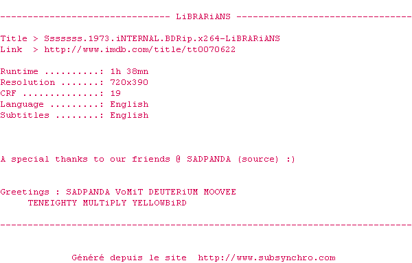 Voir le nfo de la release Sssssss.1973.iNTERNAL.BDRip.x264-LiBRARiANS