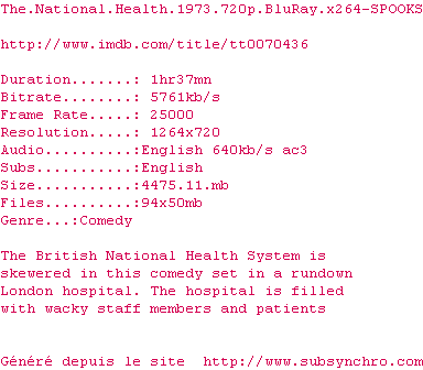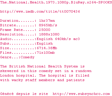 Voir le nfo de la release The.National.Health.1973.1080p.BluRay.x264-SPOOKS