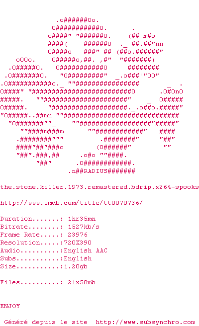 Voir le nfo de la release The.Stone.Killer.1973.REMASTERED.BDRip.x264-SPOOKS