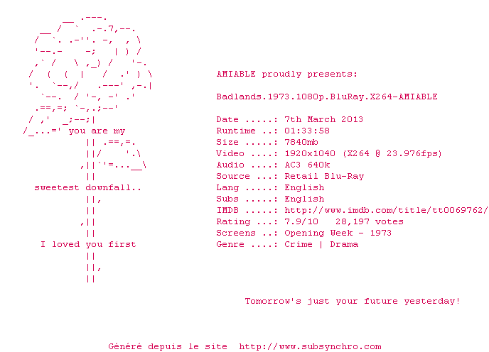 | EbP | Badlands.1973.720p.BluRay.CRITERION.x264-EbP OpenSubtitles | 30/12/2014 | Disponible en Z2 | 1 fichier | |