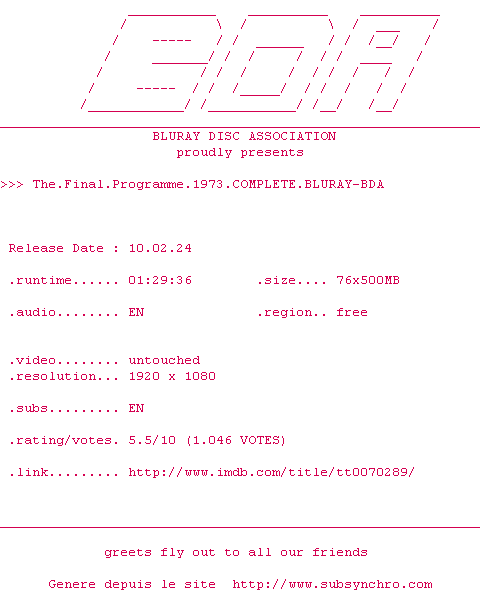 Voir le nfo de la release The.Final.Programme.1973.1080p.BluRay.x264-RUSTED