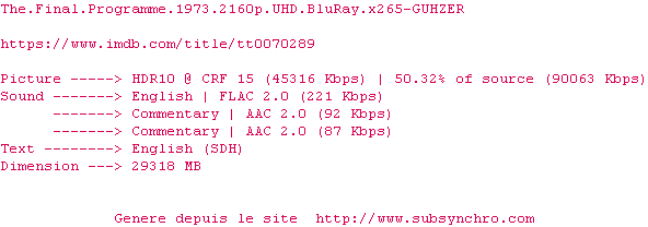 La release The.Final.Programme.1973.2160p.UHD.BluRay.x265-GUHZER est en 4K