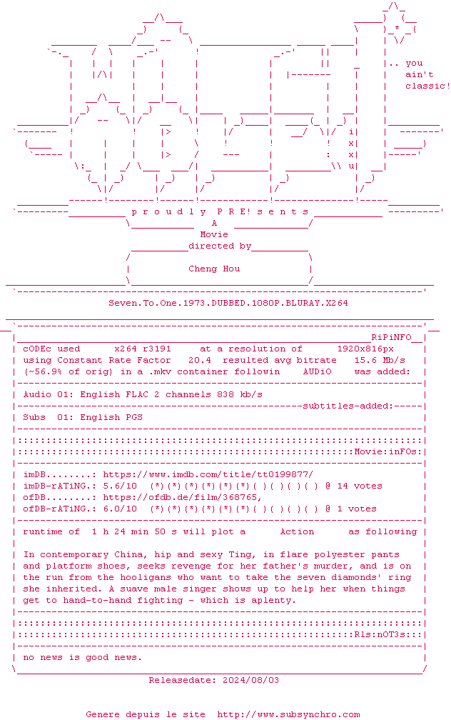 Voir le nfo de la release Seven.To.One.1973.DUBBED.1080P.BLURAY.x264-WATCHABLE