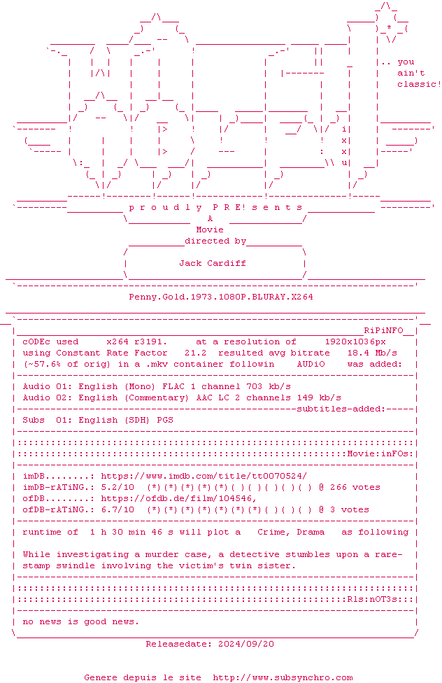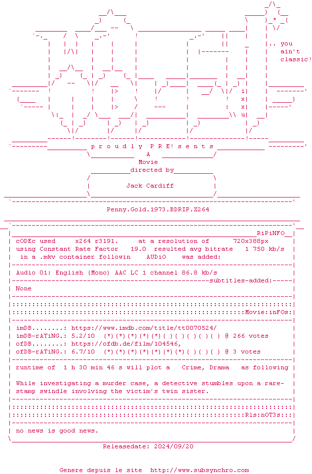 Voir le nfo de la release Penny.Gold.1973.BDRIP.x264-WATCHABLE