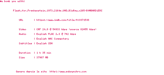 Voir le nfo de la release Flesh.For.Frankenstein.1973.COMPLETE.UHD.BLURAY-B0MBARDiERS