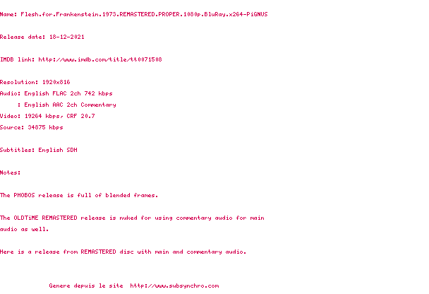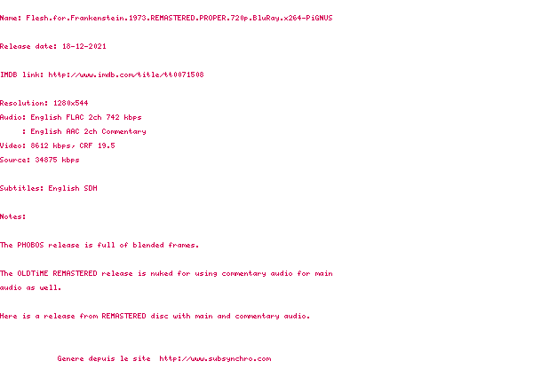 Voir le nfo de la release Flesh.For.Frankenstein.1973.REMASTERED.PROPER.1080p.BluRay.x264-PiGNUS