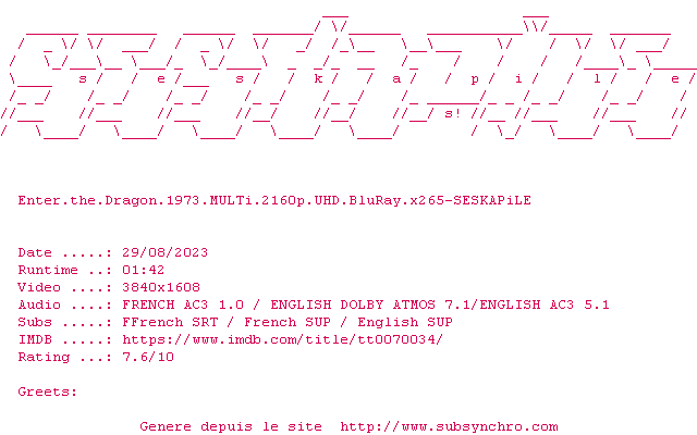 Le commentaire de Elric De Melniboné Commente par Elric De Melniboné (29), Le Lundi 17 Fevrier 2014 à 23h05 J'hallucine un peu quand je vois la date de réalisation du film... 1970... Purée, ce film n'a presque pas vieilli! Que dire, sinon que c'est un classique, un indispensable pour les amateurs de Bruce Lee. Bref si jamais (peu probable tout de même) vous ne l'avez pas vu, jetez-vous dessus. 1 0