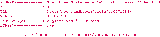 Voir le nfo de la release The.Three.Musketeers.1973.REMASTERED.1080p.BluRay.x264-OLDTiME