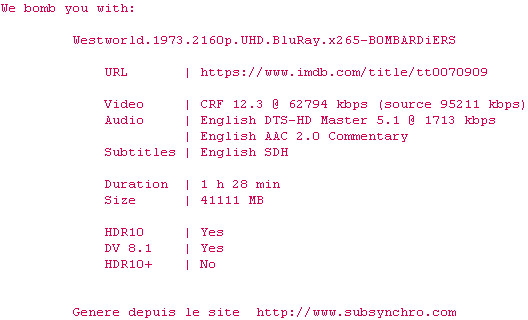 Telechargez le RSS « Fichier de la release Westworld.1973.2160p.UHD.BluRay.x265-B0MBARDiERS »