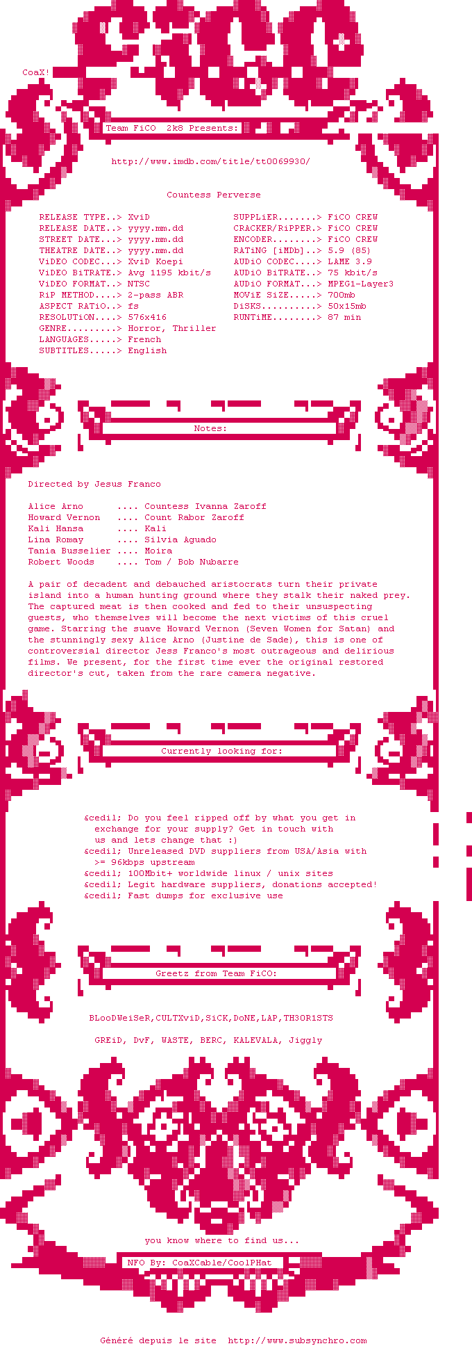 Voir le nfo de la release Countess.Perverse.1974.DVDRip.XviD-FiCO