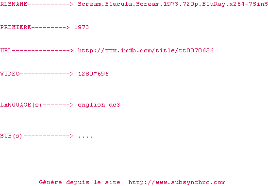 Voir le nfo de la release Scream.Blacula.Scream.1973.1080p.BluRay.x264-7SinS