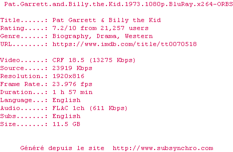 Voir le nfo de la release Pat.Garrett.And.Billy.The.Kid.1973.1080p.BluRay.x264-ORBS