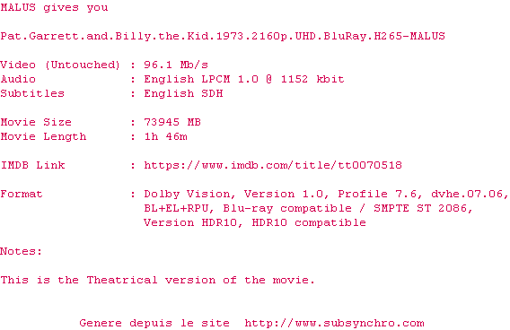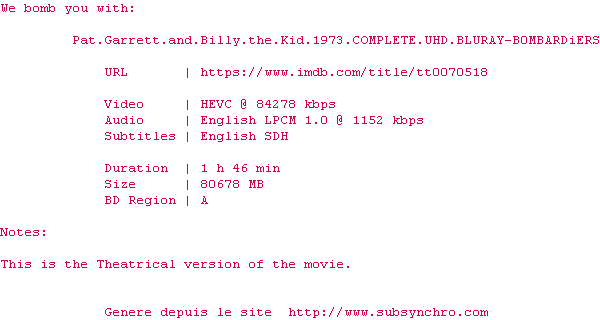 Voir le nfo de la release Pat.Garrett.And.Billy.The.Kid.1973.2160p.UHD.BluRay.H265-MALUS