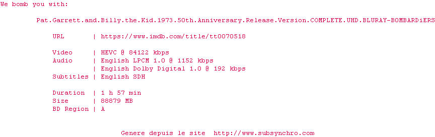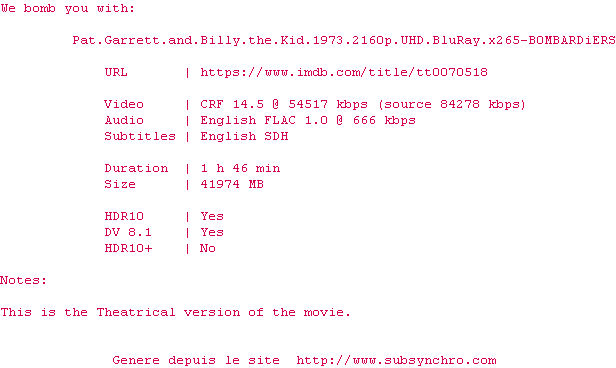 Voir le nfo de la release Pat.Garrett.And.Billy.The.Kid.1973.2160p.UHD.BluRay.x265-B0MBARDiERS